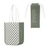 Person holding a green and white checkered tote bag and a coffee cup indoors.